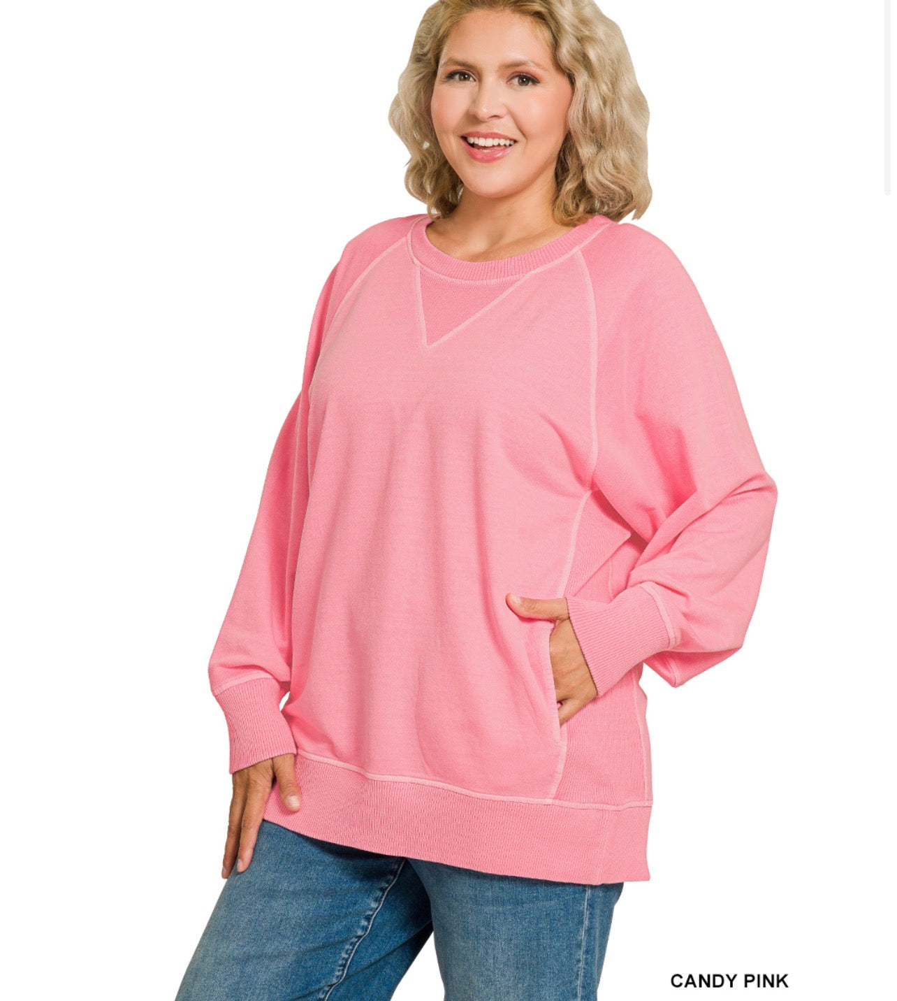 Soft, cozy, and effortlessly cute—this Candy Pink French Terry pullover is a must-have for everyday comfort. Designed with a relaxed, oversized fit, it features a classic crew neckline, exposed seam details, and roomy side pockets for that laid-back, lived-in feel we all love.