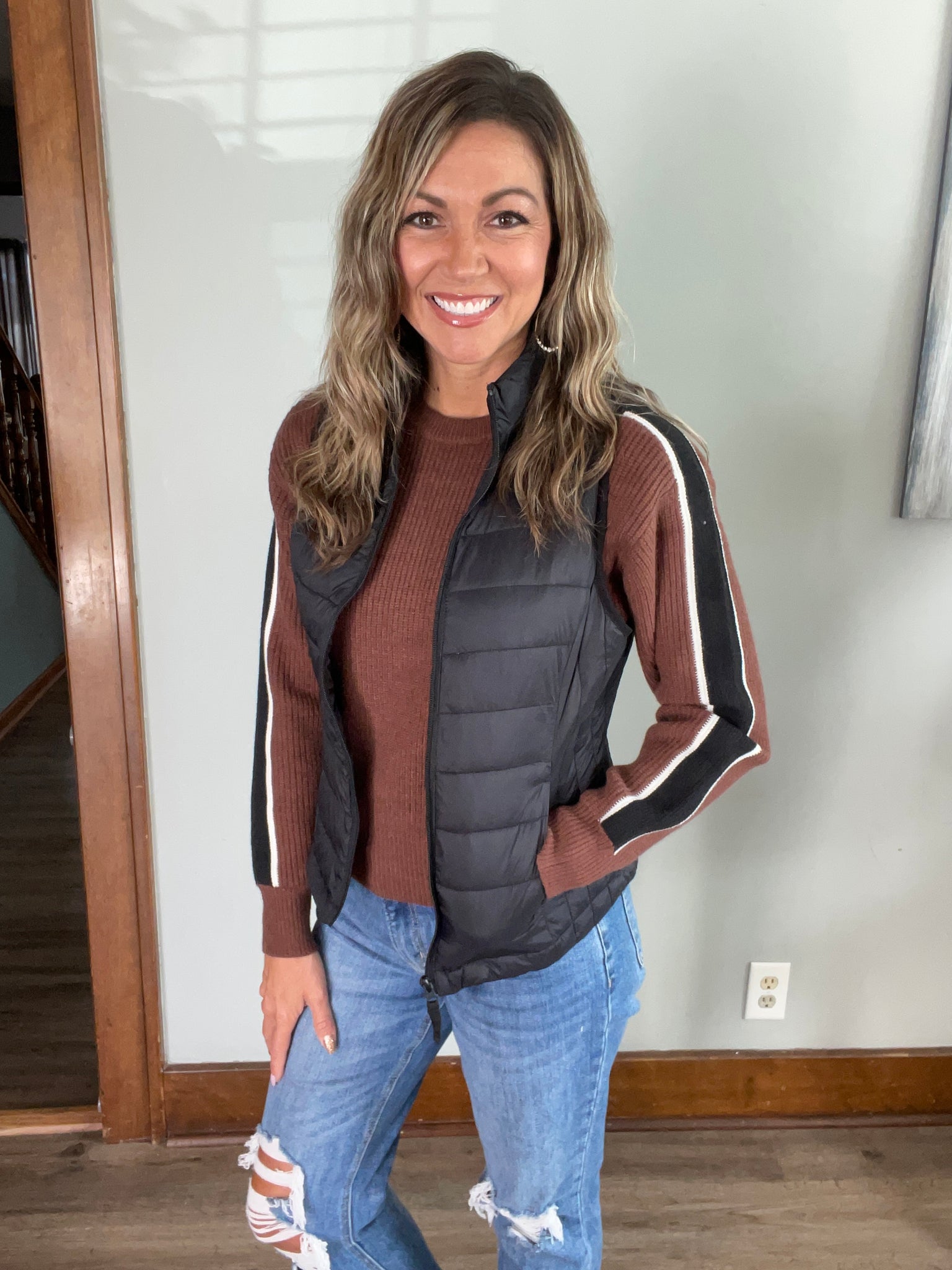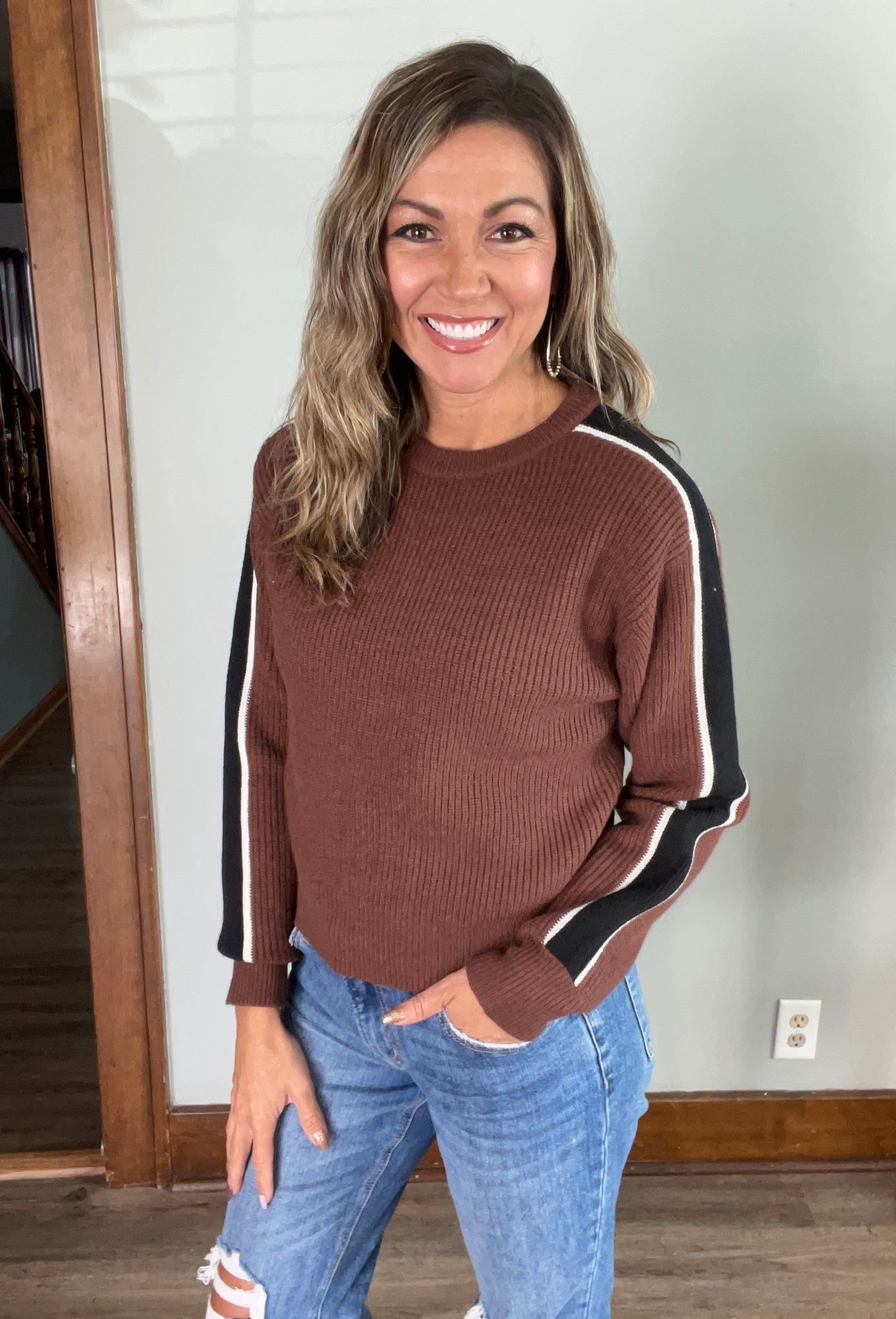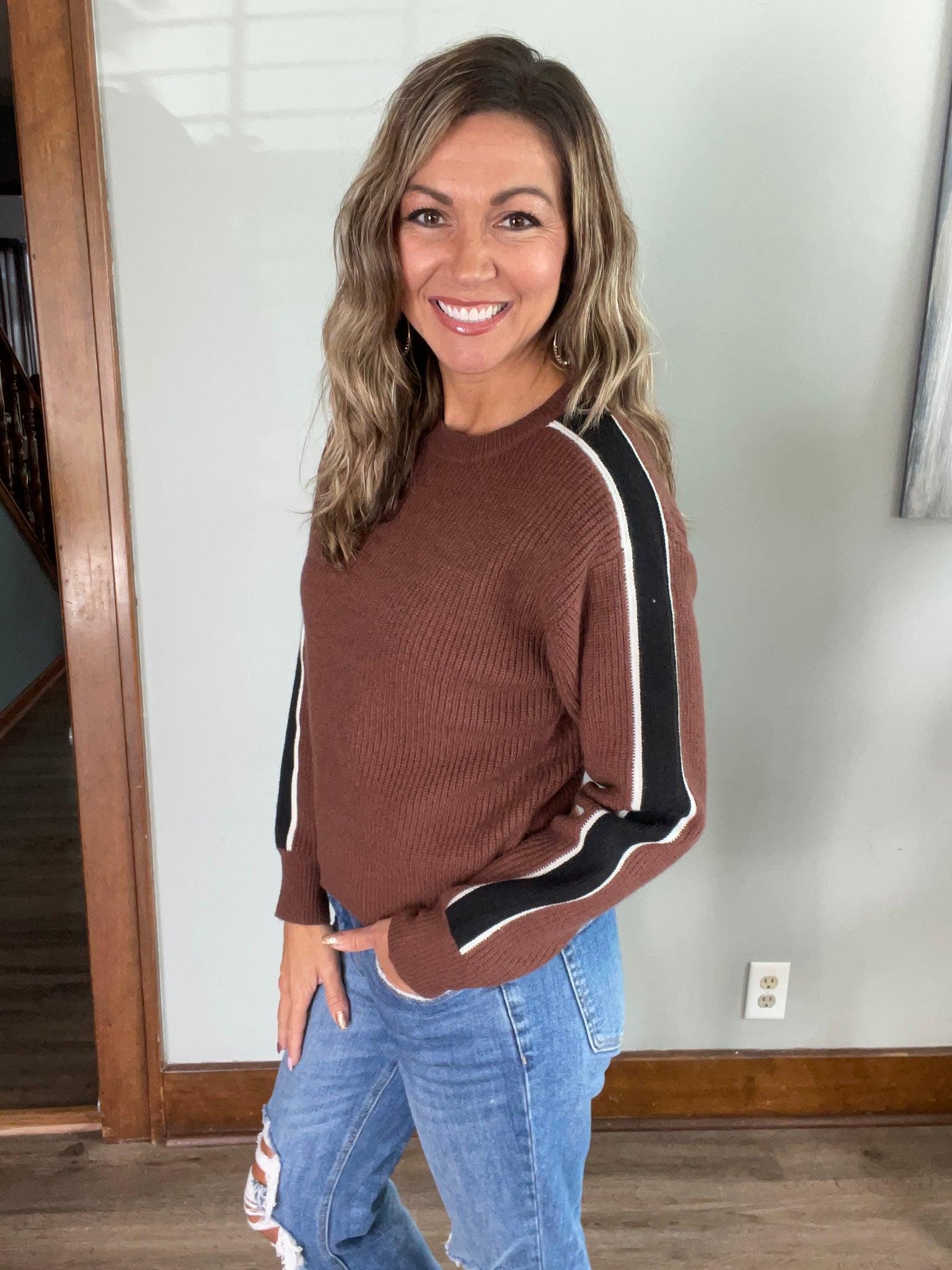 Cozy, cute, and effortlessly stylish — this ribbed knit sweater is the perfect staple for cooler days. The rich brown color is warm and flattering, while the bold black-and-cream stripes down the sleeves add the perfect sporty-chic touch.