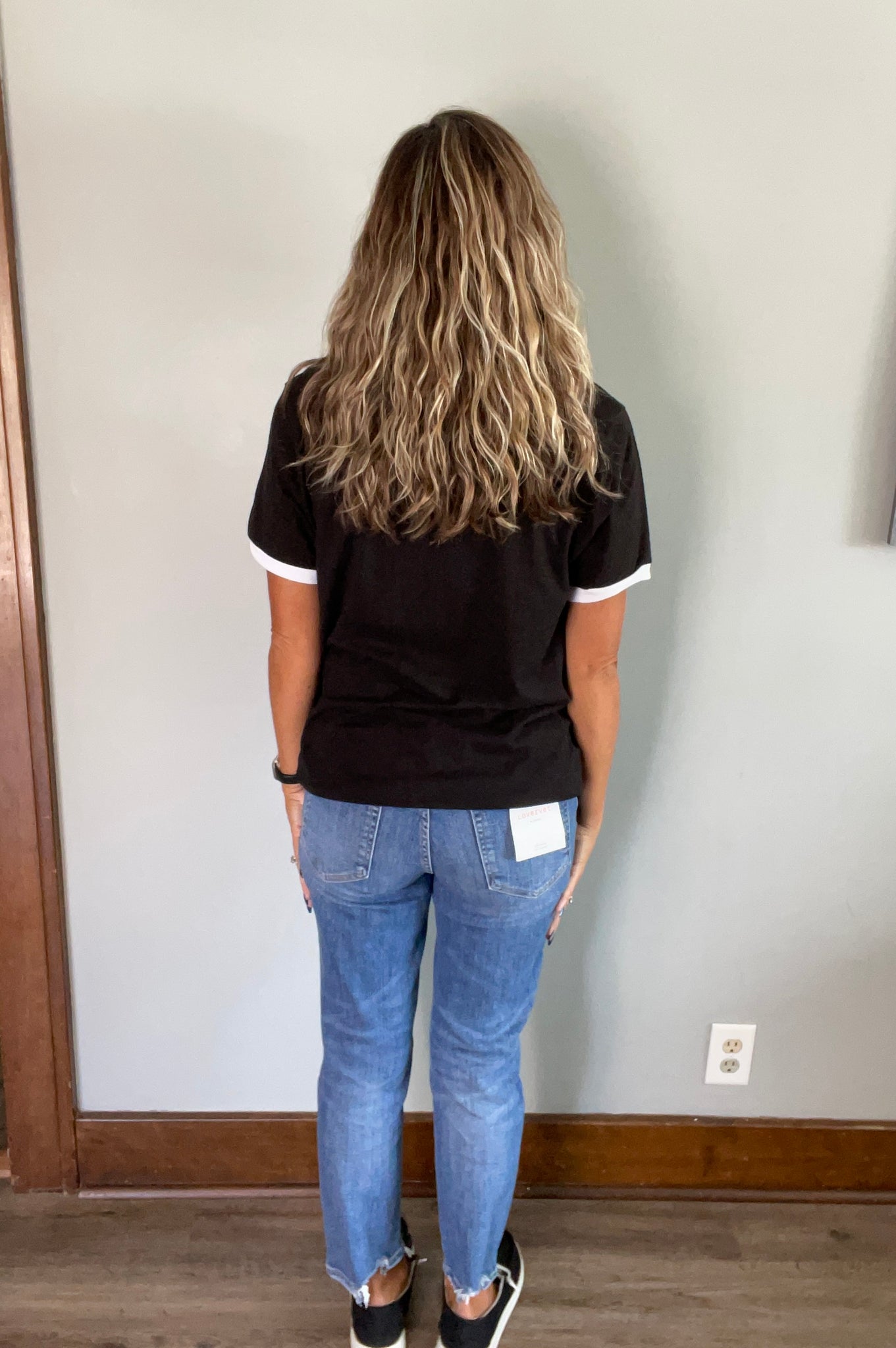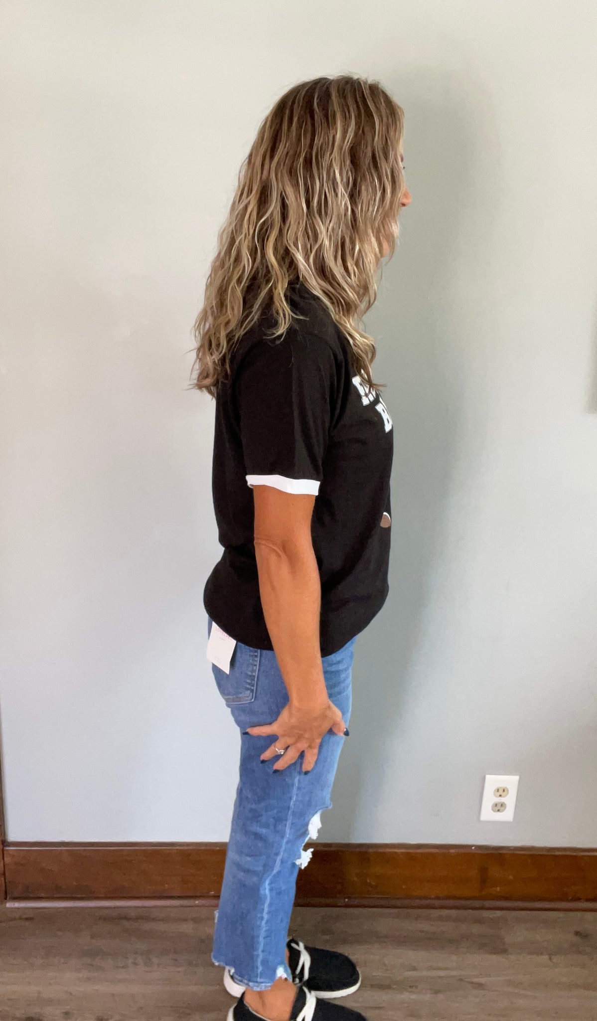 Bring the fun to football season with this playful graphic tee! Featuring a retro cartoon football character and bold “Falls Out Balls Out” lettering, this ringer-style t-shirt is perfect for game days, tailgates, or just kicking back with friends. The black body with contrasting white trim gives it that vintage athletic vibe you’ll love.