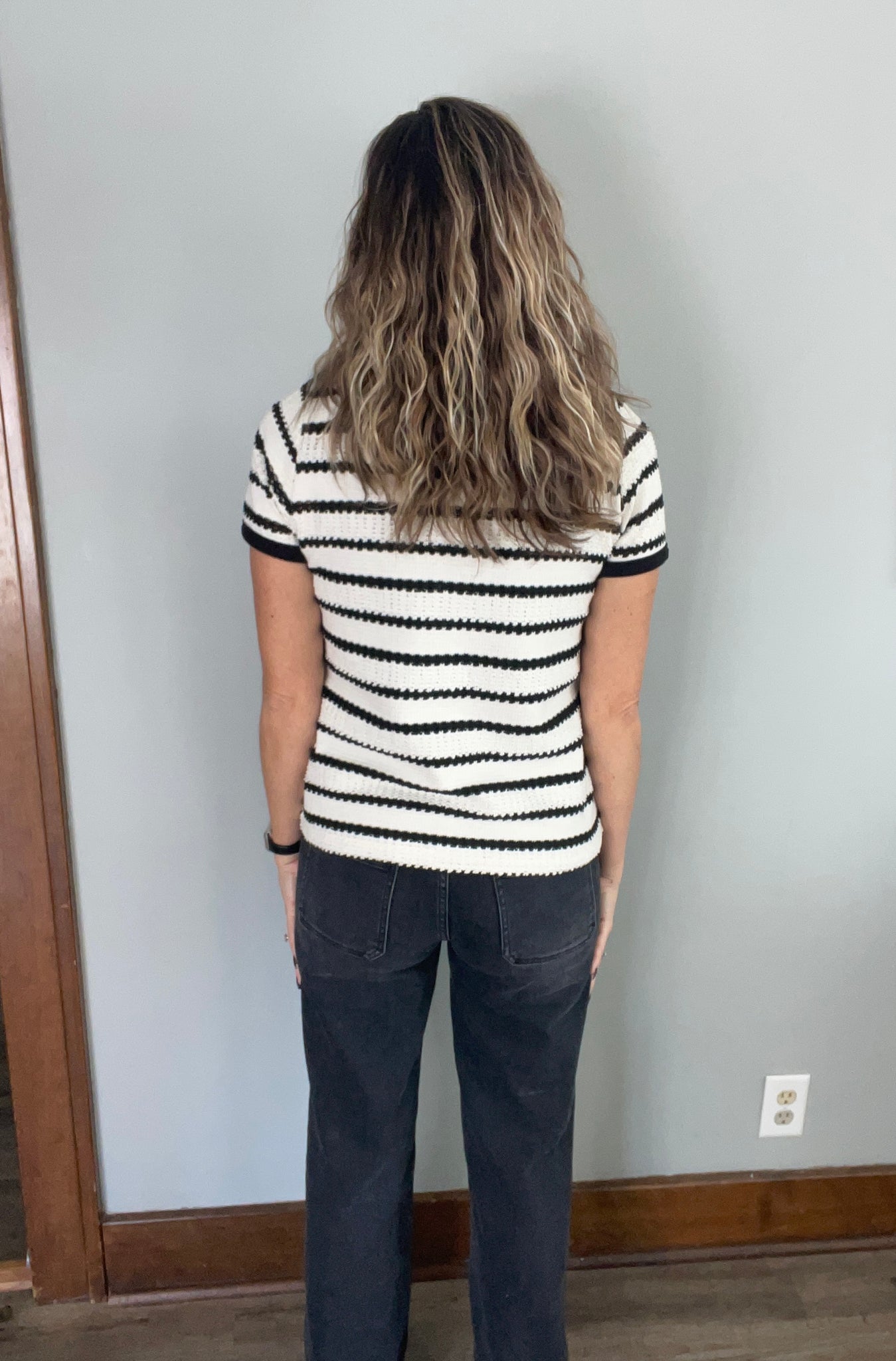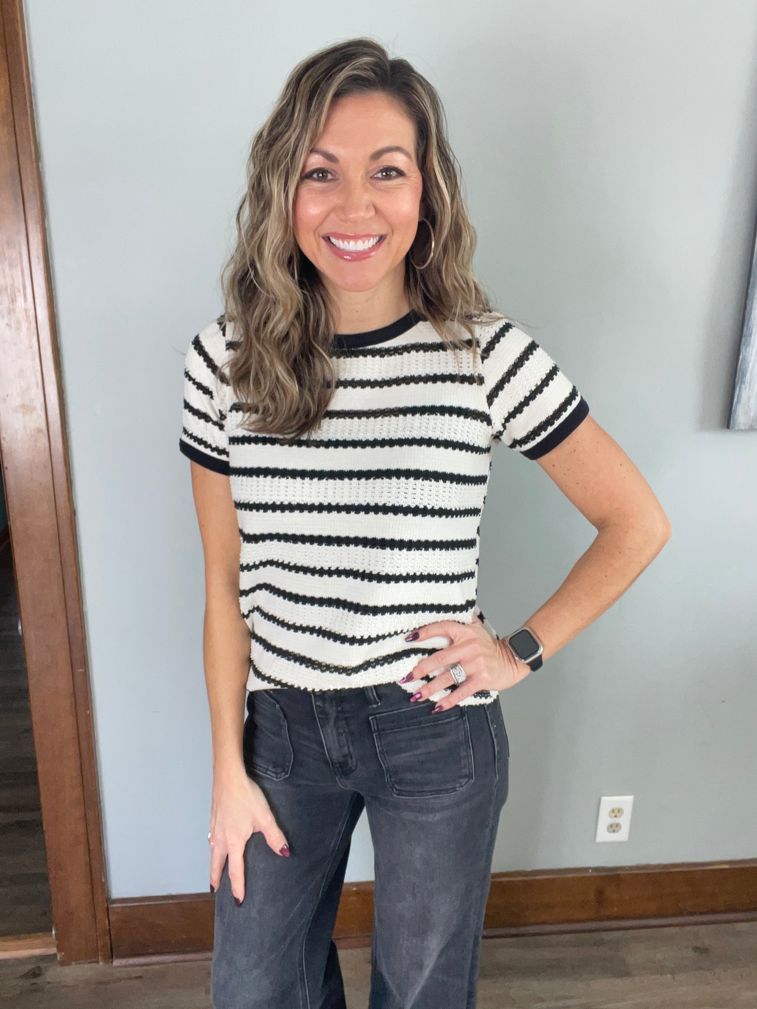 This ivory and black crochet top is a timeless piece you’ll reach for again and again. Designed with a lightweight open-knit texture and classic horizontal stripes, it features contrasting black trim at the neckline and sleeves for a polished finish. The relaxed yet flattering fit makes it easy to style for everyday wear or dress up for a more elevated look.
