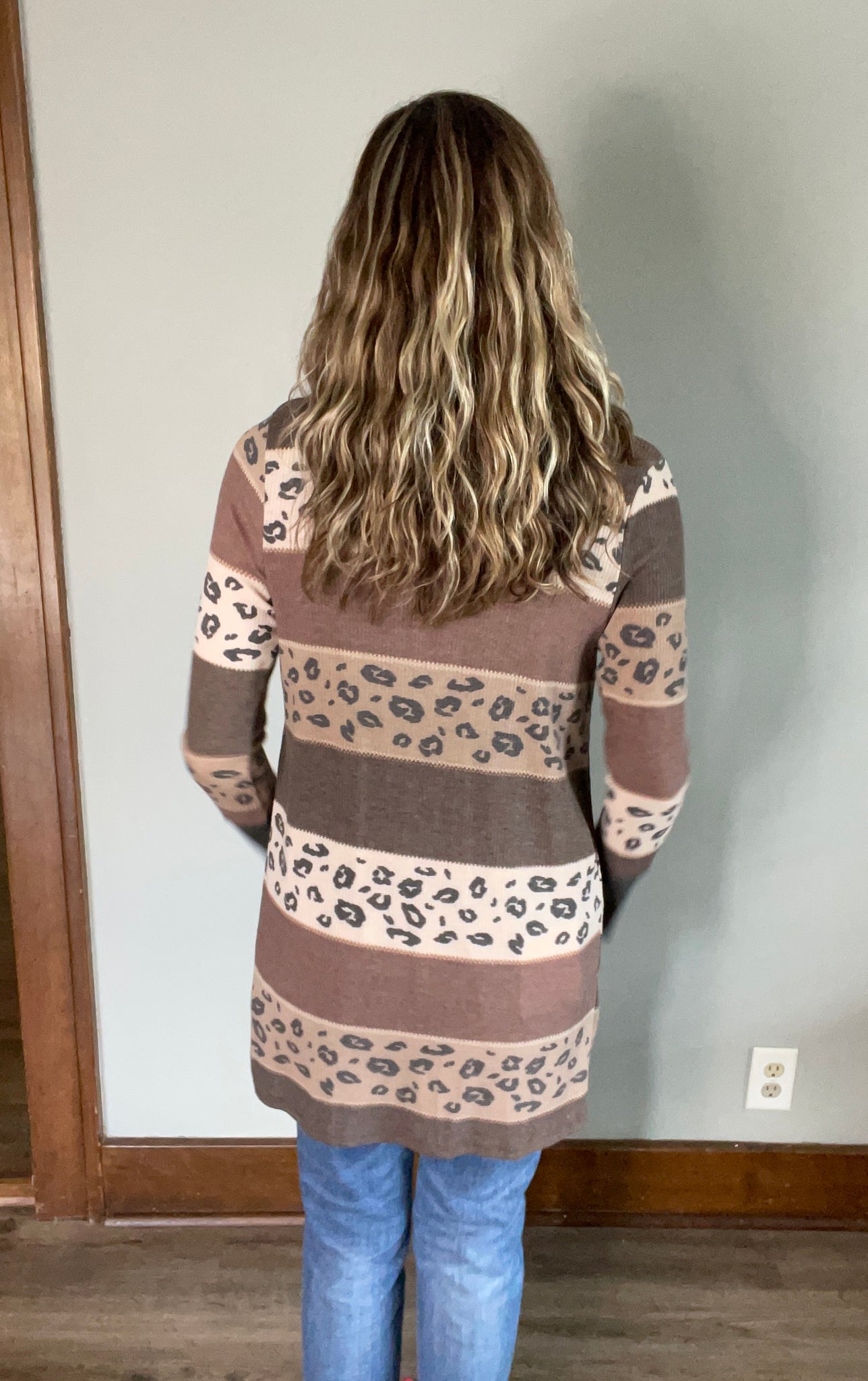 Add the perfect pop of pattern to your wardrobe with this cozy leopard + stripe cardigan! Featuring alternating blocks of soft neutrals and bold leopard print, this open-front style is both fun and versatile. Lightweight with plenty of stretch, it’s perfect for layering over your favorite tanks, tees, or blouses.