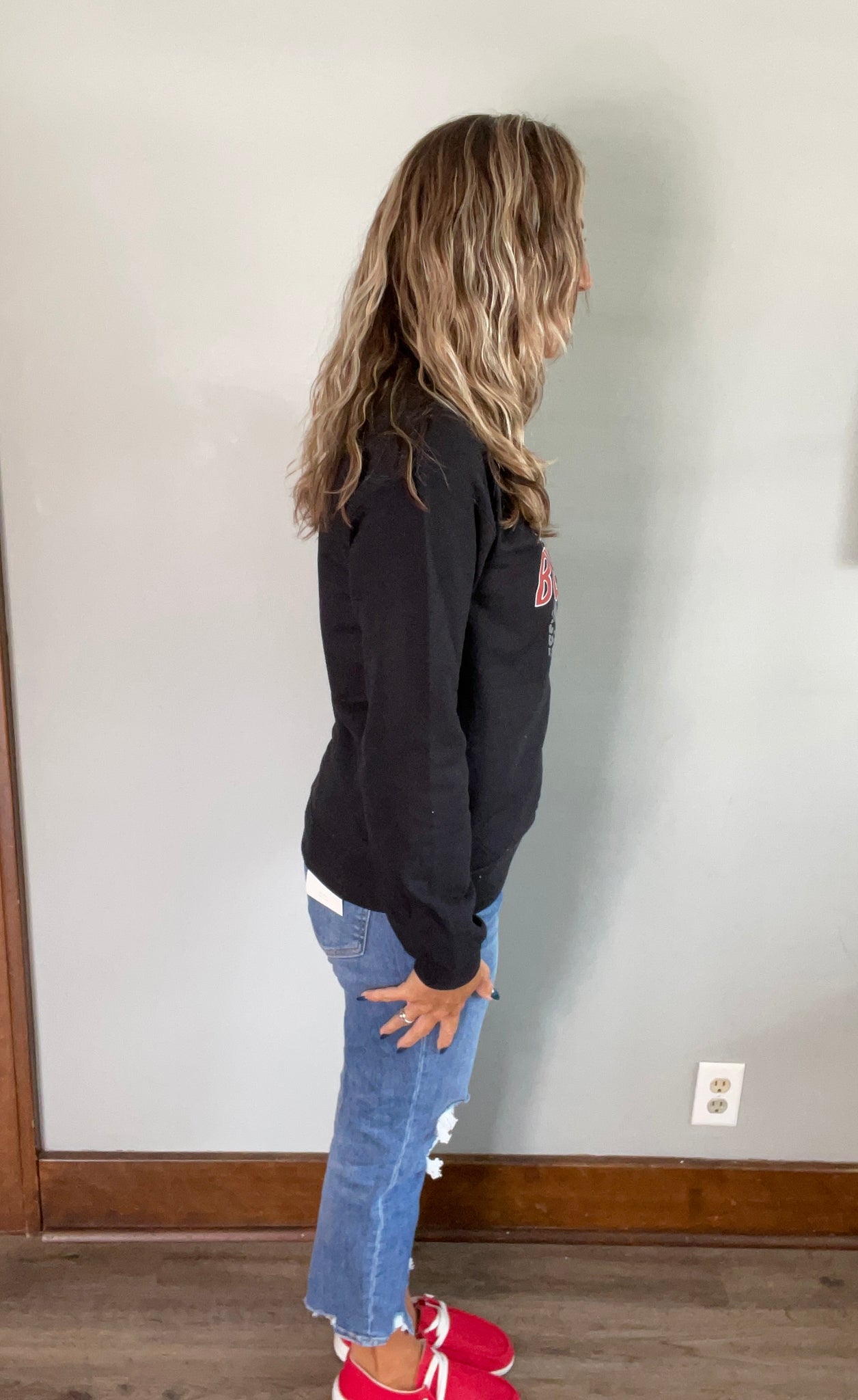 Cheer on your team in style with this cozy game-day sweatshirt! Featuring a bold “Let’s Go Buckeyes” graphic across the front with a trendy leopard football design, this sweatshirt is the perfect blend of sporty + chic. The sleeve detail adds an extra touch of spirit with “Ohio State” written down the arm.