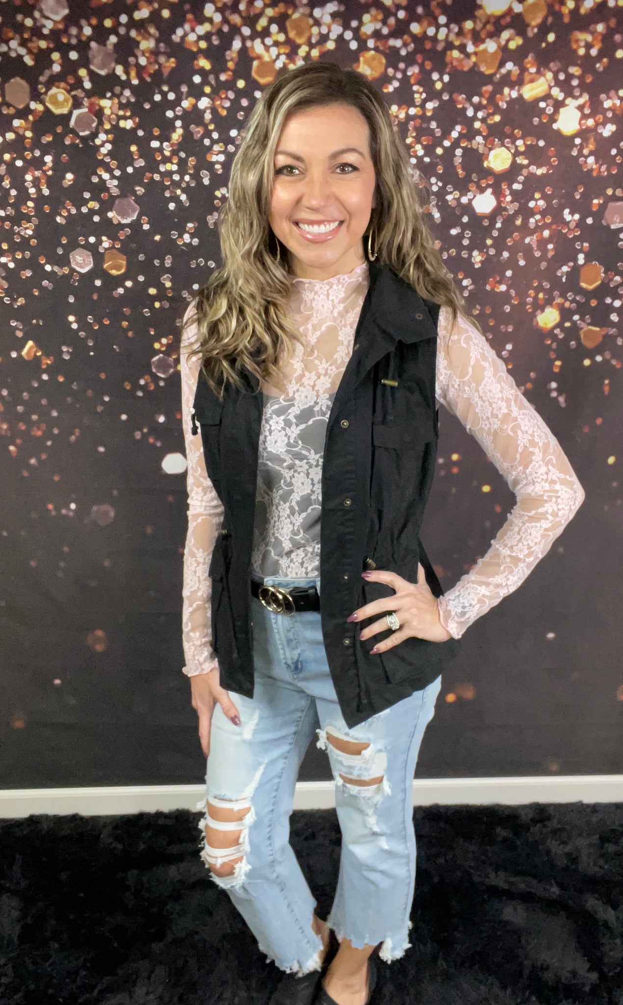 If you are in between sizes you can size up 1. Brittany is wearing a size medium.
