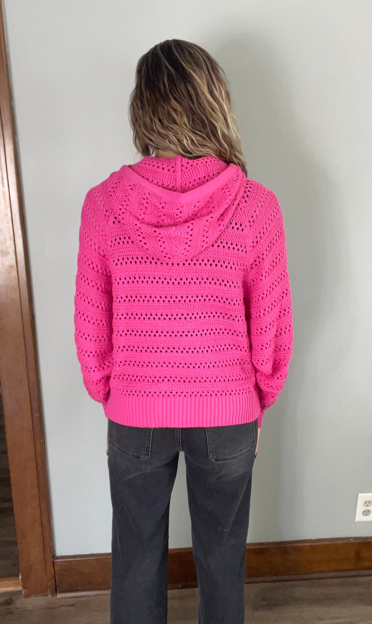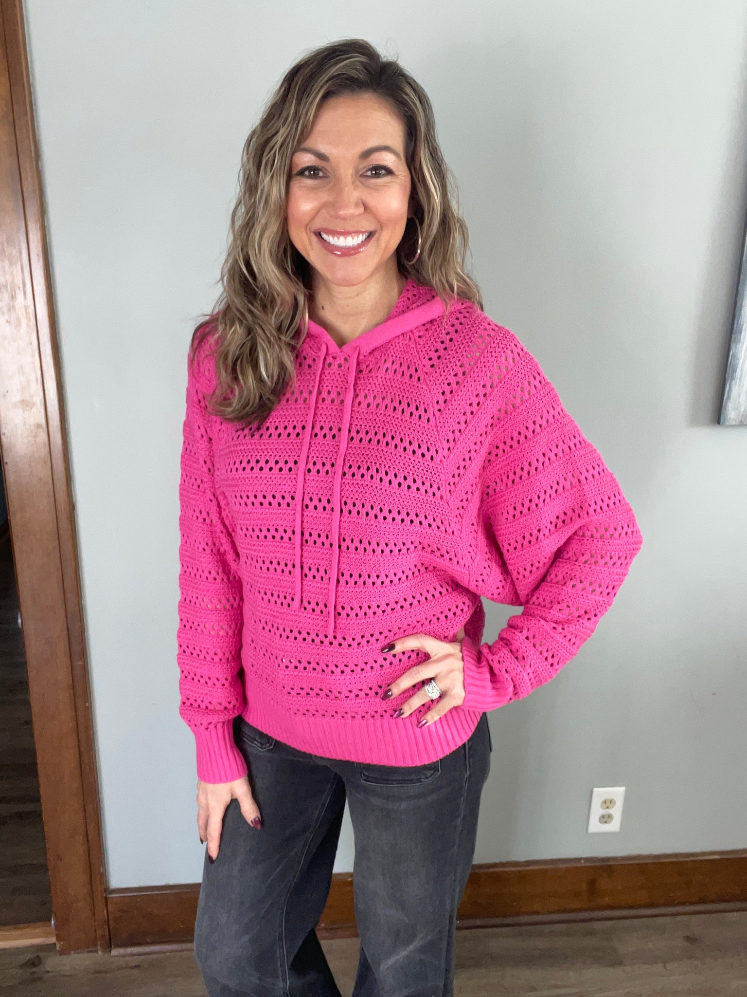 Make a statement in this stunning fuchsia crochet hoodie sweater š Featuring an eye-catching open-knit crochet design, this sweater is the perfect mix of cozy and chic. The relaxed dolman sleeves give it an effortless, drapey fit, while the adjustable hood adds a casual, sporty touch.