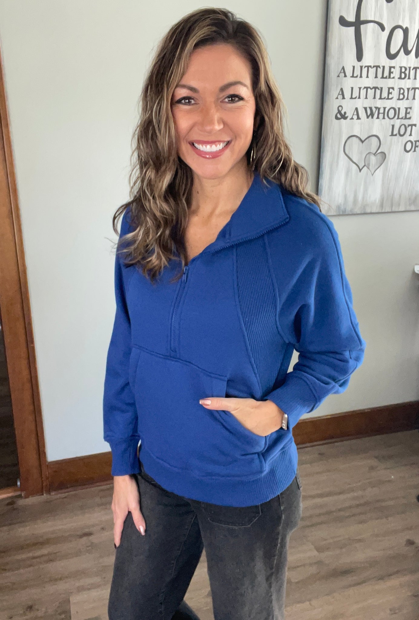 Bright, bold, and effortlessly cozy — this royal blue half-zip pullover is the perfect mix of comfort and style. The ribbed detailing along the shoulders and sides gives it a flattering, structured look, while the kangaroo pocket adds the perfect touch of casual comfort.