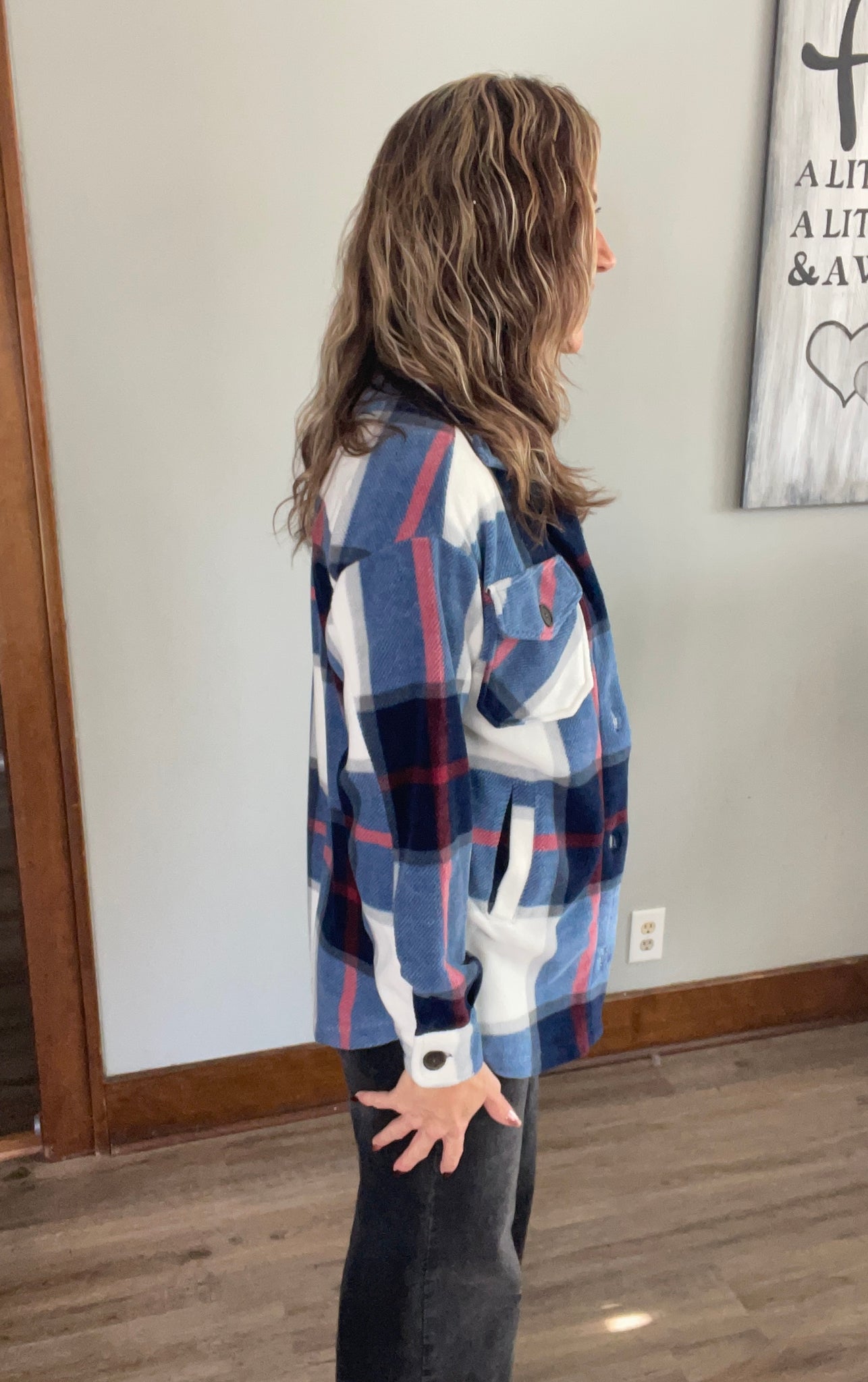 This navy, red, and ivory plaid shacket is the perfect blend of cozy and cute! Made with a soft, brushed fabric that feels like a warm hug, it features a classic button-front design, functional chest pockets, and an easy, relaxed fit that layers beautifully over tees and tanks.
