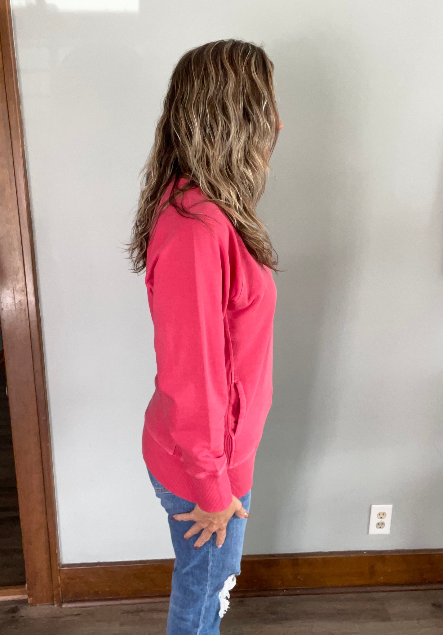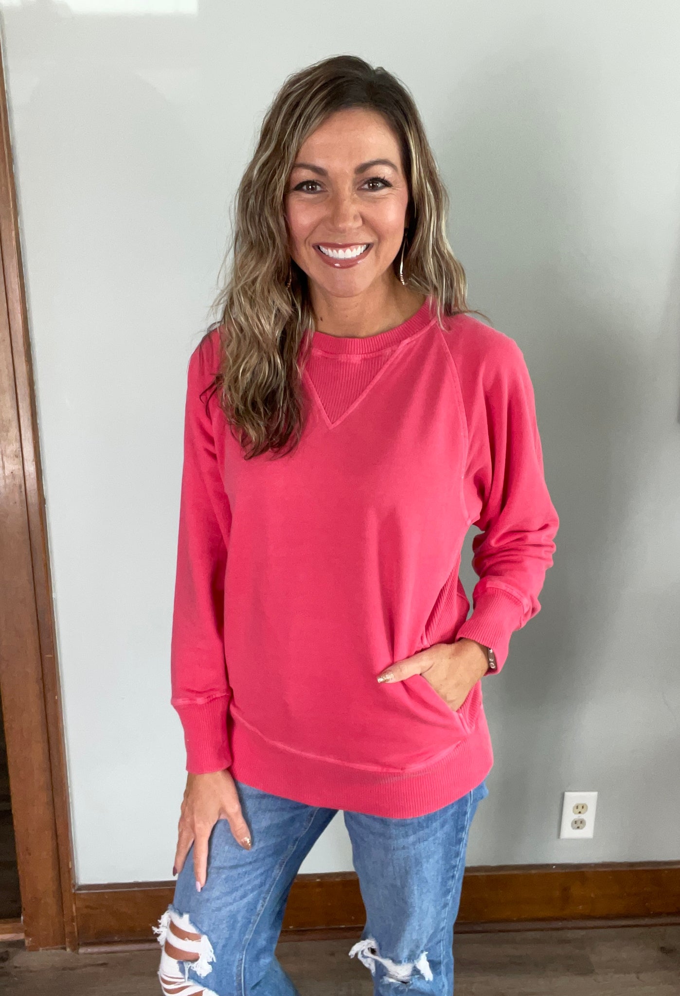 Meet your new everyday favorite. This vibrant red crewneck is soft, lightweight, and effortlessly comfy — perfect for layering or wearing solo. Designed with a relaxed fit, ribbed trim details, and a front kangaroo pocket for that extra touch of cozy convenience.